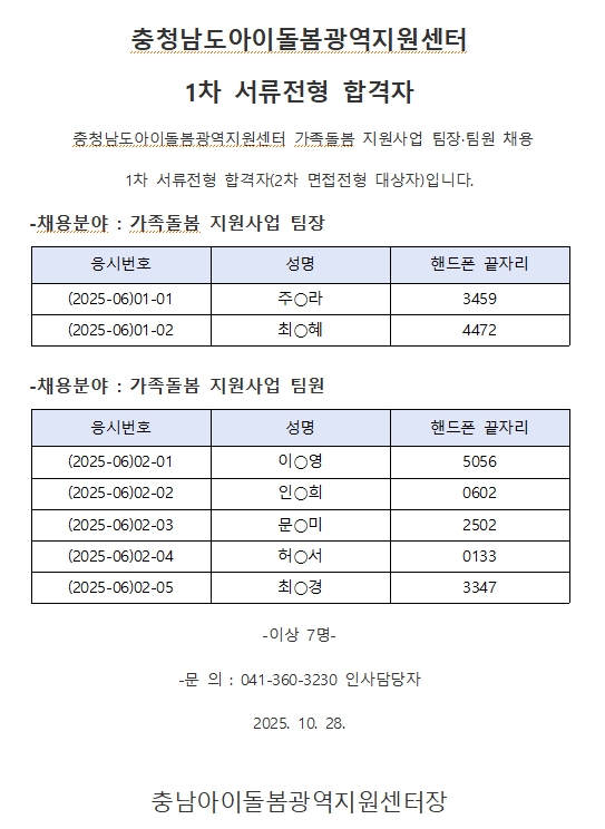 2025년 충남아이돌봄광역지원센터 가족돌봄지원사업 팀장, 팀원 1차 서류전형 합격자