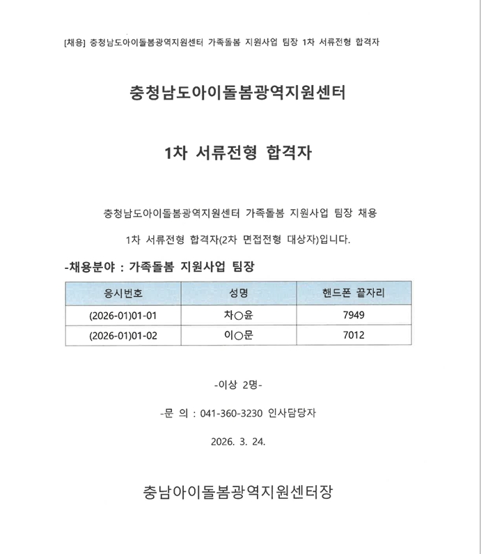 - 2026년 충남아이돌봄광역지원센터 가족돌봄 지원사업 팀장 1차 서류전형 합격자 명단.pdf (31.4K) 다운로드