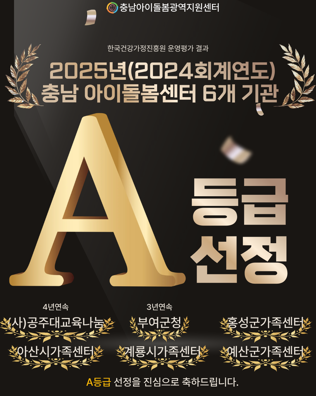 2025년(2024년 회계연도) 충남 6개 아이돌봄센터 A등급 선정